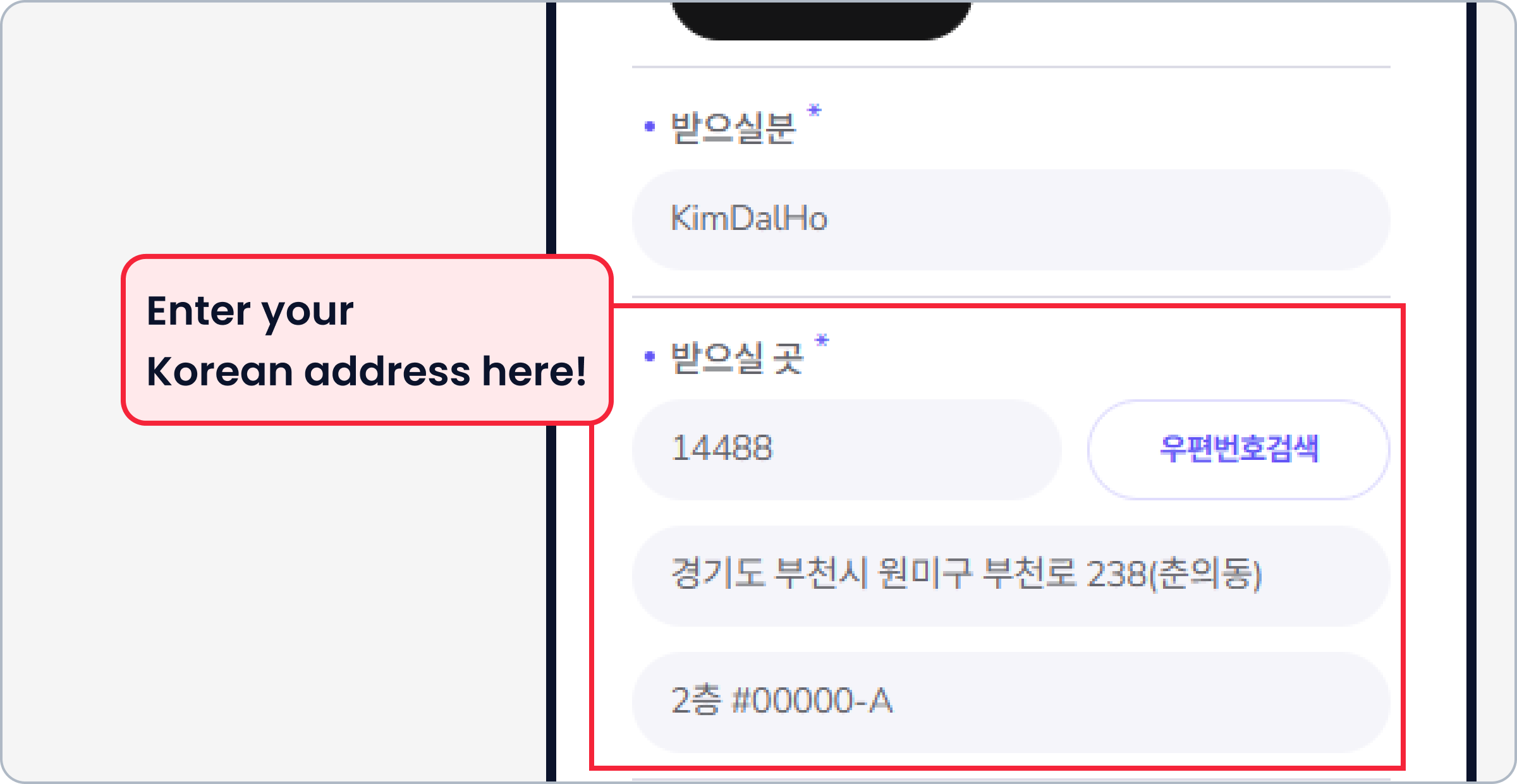 DIRECCIÓN :경기도 부천시 원미구 부천로 238, 2층 #[Tu código personal], Código postal 14488
